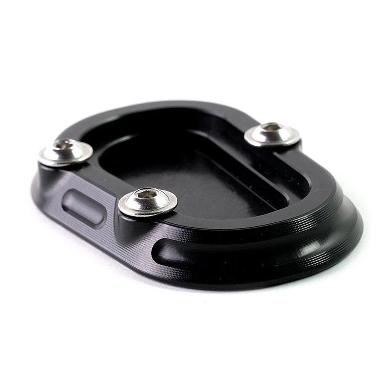 La superfice di appoggio del cavalletto originale e’ piuttosto misera. Su fondo morbido o asfalto bollente questa piastra in Ergal ricavata dal pieno consente un appoggio sicuro. Anodizzata nera antiossidante con incisione e logo sulla dentatura. Si monta in pochi minuti.