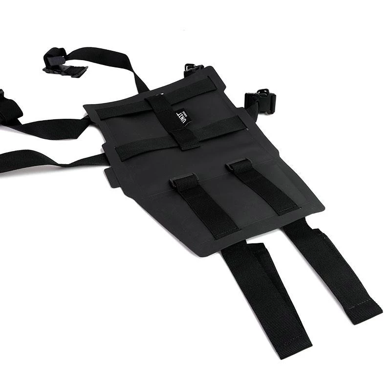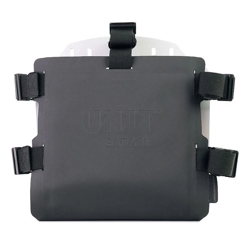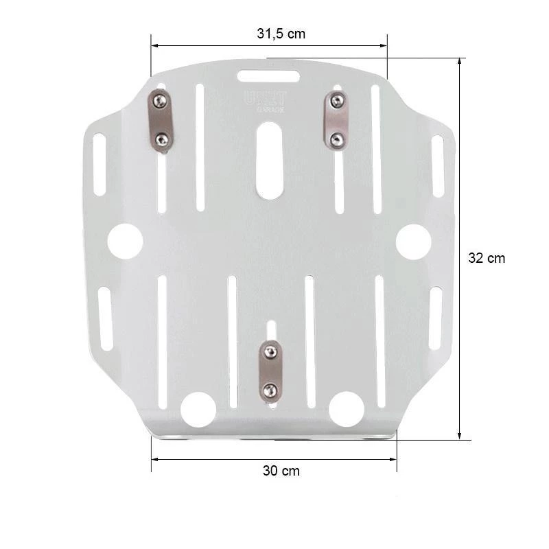 Piastra portaborse in alluminio anodizzato completa di frontale in Hypalon regolabile, cavallotti e viteria. La piastra puo’ essere fissata molto velocemente a qualsiasi telaio in tubo per borse in alluminio con i 4 cavallotti in dotazione, creando una superficie di montaggio piatta sul lato della moto, questo consentira’ il trasporto di borse senza aggancio o altri oggetti, tipo sacco a pelo, giacche etc. È compatibile con tutti i sistemi in tubo presenti sul mercato sia OEM che aftermarket. La patta frontale, curata nei minimi dettagli con finiture in cuoio da 3 mm, puo’ essere regolata tramite i cursori in dotazione e puo’ essere rimossa molto velocemente dalla piastra.