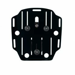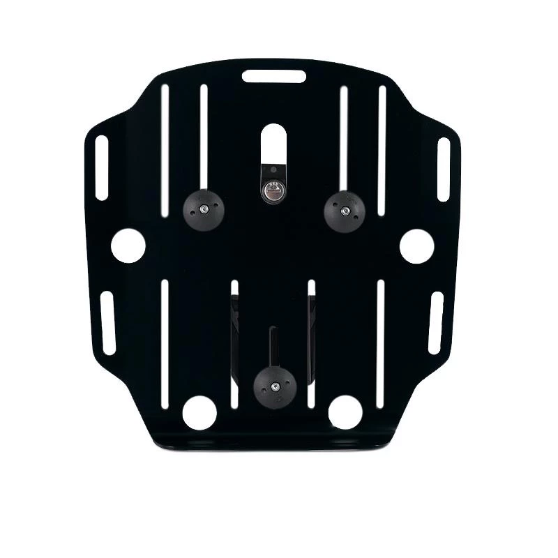 Piastra portaborse in alluminio anodizzato. Si aggancia velocemente ai nostri telai porta borsa con il sistema a sgancio rapido cod.U000 già incluso e montato sul retro della piastra, che è provvisto di serratura per il bloccaggio sul telaio stesso. creando una superficie di montaggio piatta sul lato della moto, questo consentira’ il trasporto di bagagli di vario genere, ad esempio, sacco a pelo, tenda, borse o roll di varie misure. La piastra curata nei minimi dettagli, è dotata di varie asole per il fissaggio di fasce o straps.