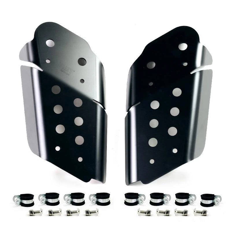 Oltre a fornire una ulteriore protezione al radiatore in caso di caduta conferiscono alla Pan America un particolare aspetto Racing. Si fissano al tubo di protezione originale montato sul modello special con i supporti in dotazione. I supporti sono protetti da gomma antivibrante che non rovina la verniciatura della barra originale.