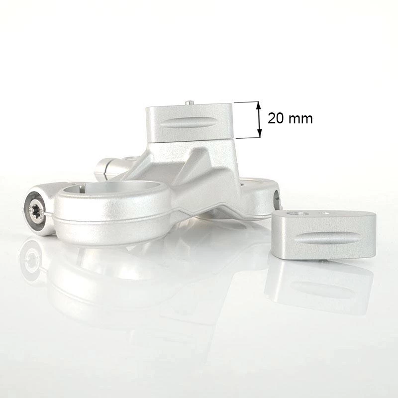 Speciali riser manubrio da noi progettati e realizzati al CNC, ricavati dal pieno in pregiata lega di alluminio con finitura Argento.