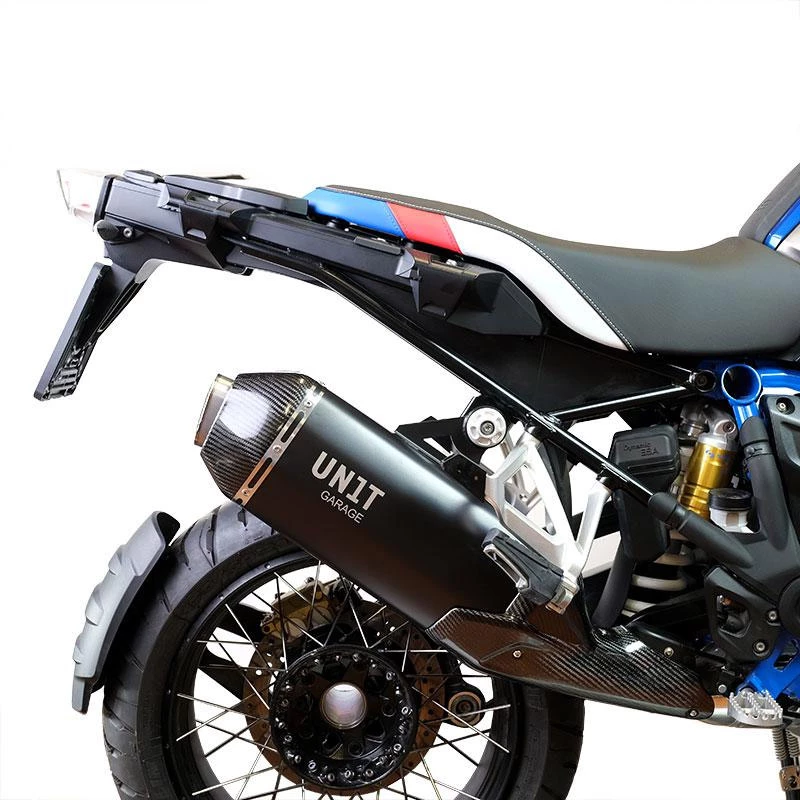Per la Gs Unit Garage voleva uno scarico raffinato ed elegante, ma anche potente. Prestazioni e leggerezza: sound profondo su tutta la curva di potenza e grande risparmio di peso. Silenziatore omologato realizzato in Acciao inox con finitura nero opaco e protezione paracalore anteriore e terminale in Carbonio. La rete frangifiamma in Titanio ed il terminale in Carbonio possono può essere rimossi per accedere al DB-Killer. Si monta sui collettori originali lasciando valvola di scarico e catalizzatore di serie. Non necessita di rimappare la centralina. Pesa circa 3 kg in meno di quello originale. Si monta facilmente in pochi minuti sul supporto originale,ed è compatibile con tutte le valige originali o aftermarket. Il sound vi farà impazzire e l’erogazione…anche!